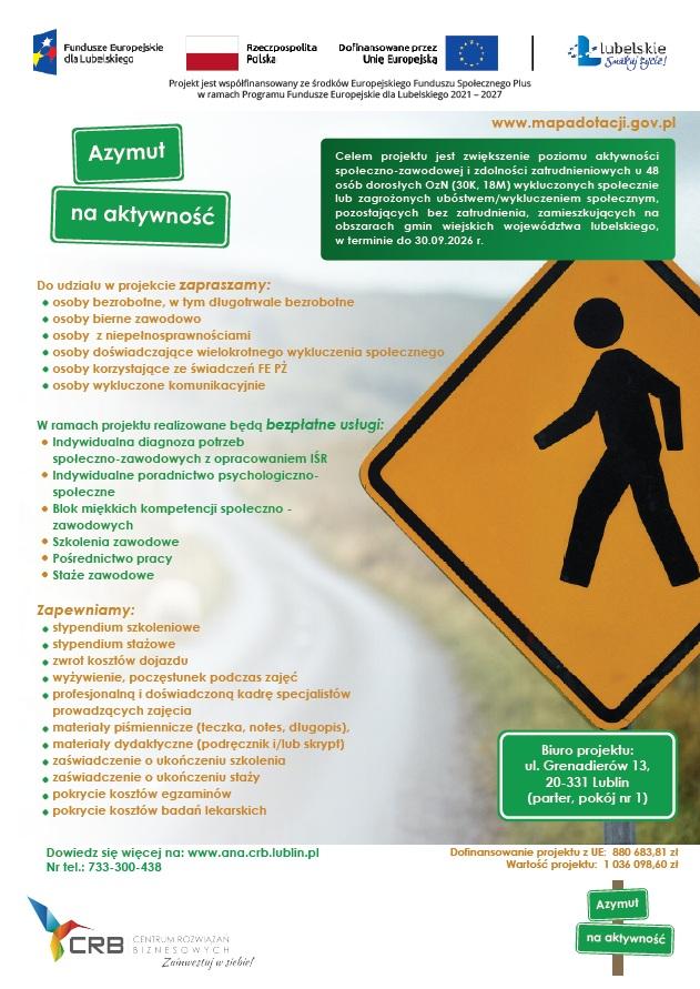 Fundacja Centrum Rozwiązań Biznesowych w Lublinie w partnerstwie z firmą IT-INPRO Samodulski, Kisiel spółka cywilna informuje o realizacji projektu w ramach Osi Priorytetowej VIII Zwiększenie spójności społecznej, Działania 8.1 Aktywizacja społeczna i zawodowa programu Fundusze Europejskie dla Lubelskiego 2021-2027 pn. „Azymut na aktywność” nr projektu: FELU.08.01-IP.02-0068/24.