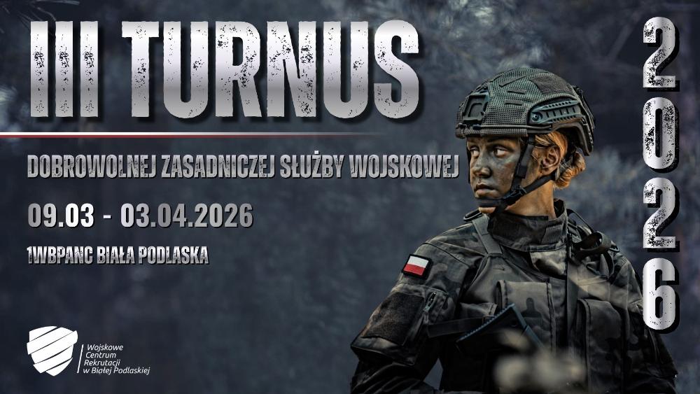 Wojskowe Centrum Rekrutacji w Białej Podlaskiej informuje o naborze na III turnus Dobrowolnej Zasadniczej Służby Wojskowej, który realizowany będzie w terminie 09.03–03.04.2026 r. w 1 Warszawskiej Brygadzie Pancernej Białej Podlaskiej.