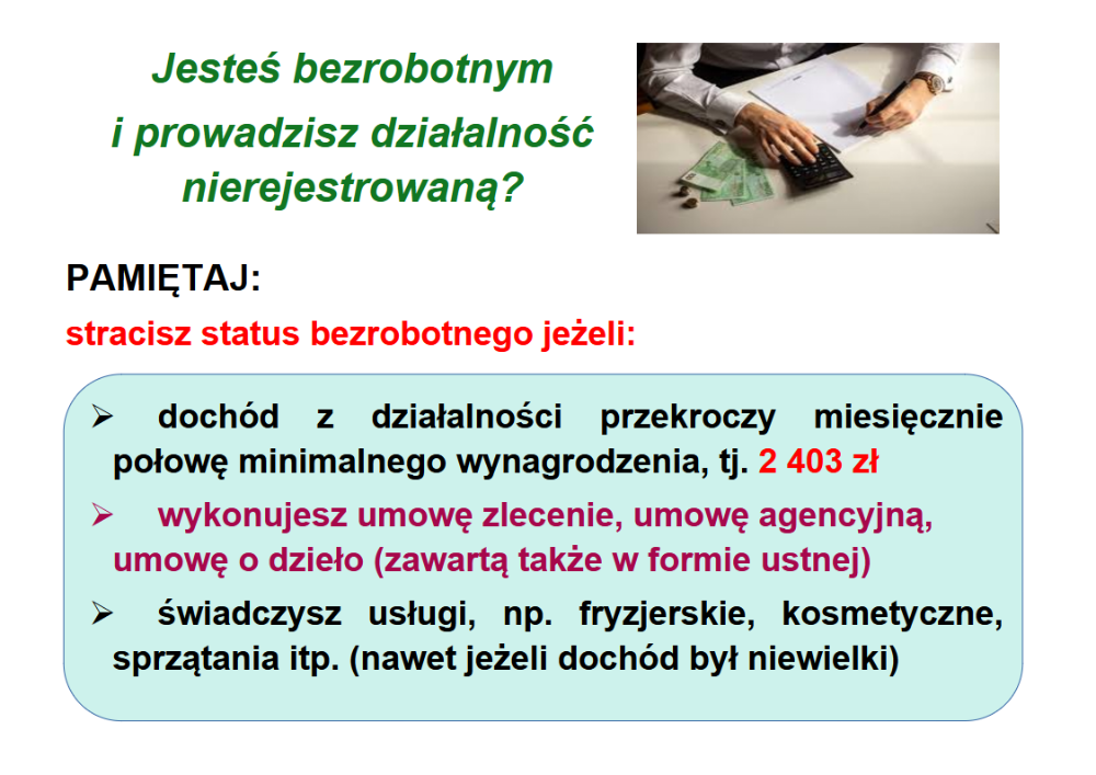 Natomiast działalność nierejestrowana, która opiera się wyłącznie o umowy sprzedaży może być prowadzona przez zarejestrowanych bezrobotnych, jednak ograniczona jest nadal wysokością uzyskiwanego przez nie przychodu.